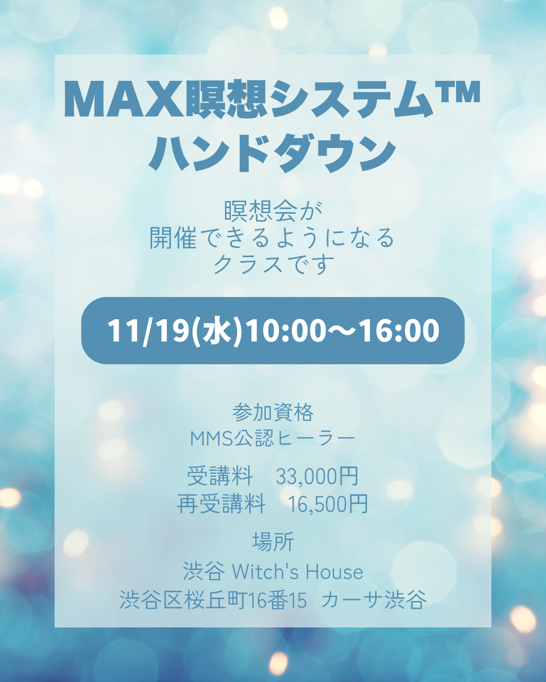 MAX瞑想システム™︎ハンドダウン クラス内容:MAX瞑想システムTMを一般の方に向けて開催できるようになるためのハンドダウン(伝授)を行います。MAXメディテーションシステム™ は、次の5つのコンポーネントで構成されています。1.リラクゼーション2.受動的瞑想(パッシブ・メディテーション)3.能動的瞑想(アクティブ・メディテーション)4.誘導瞑想5.スージング・ダウン(クールダウン)この方法を使うことで、安全・安心・そして、確実に効果の上がる瞑想体験をクライアント様にしていただくことが可能になります。日時:11/19(水)10:00〜16:00参加資格:MMSヒーラーズアカデミー1修了者で、MAX瞑想システムTMを受講済の方料金:33,000円(再受講料 16,500円)お申し込みはこちらから